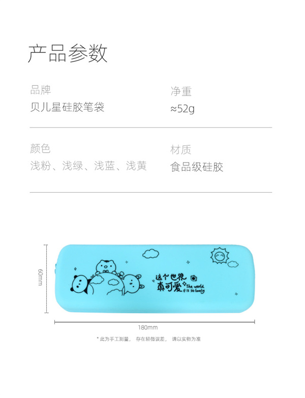 收納硅膠筆袋主要用于文具筆墨橡皮存放,適用于中小學兒童學生收納,學堂用文具盒,可用于存放170MM以下的筆和各種學習工具,也可存放收納其他物品以及小型禮品,表面圖案為卡通形狀適用于6-12周歲兒童使用!